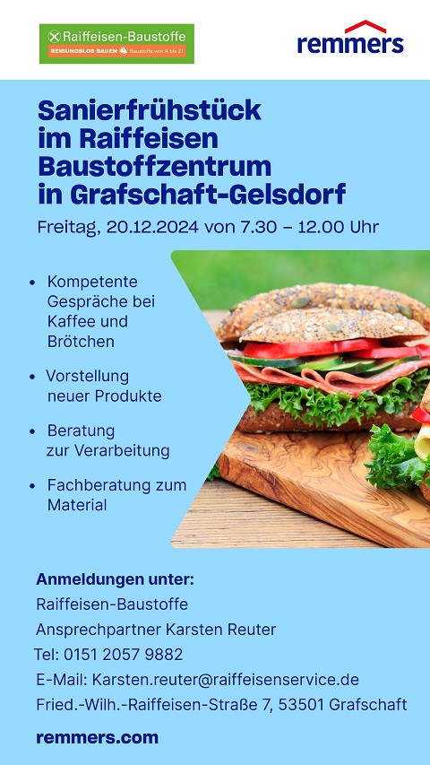 Am Freitag, den 20. Dezember 2024, lädt das Raiffeisen Baustoffzentrum in Grafschaft-Gelsdorf alle Interessierten Handwerker und Bauprofis herzlich zu einem Sanierfrühstück ein.