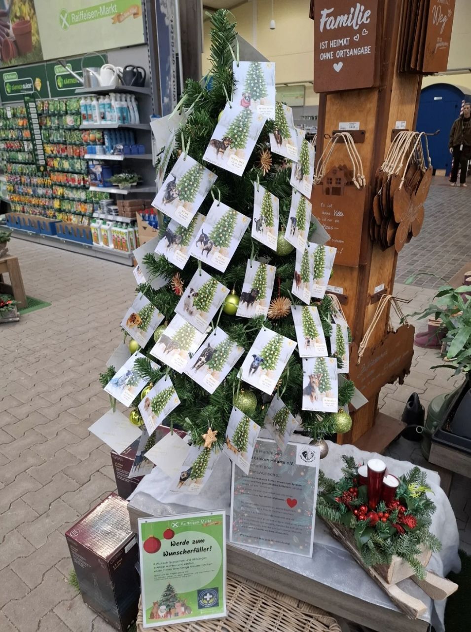 Im Dezember 2025 wurde in allen unseren Raiffeisen-Märkten im Rahmen einer Kooperation mit einem lokalen Tierschutzverein jeweils ein Wunschbaum aufgestellt. An den Wunschbäumen hingen zahlreiche Herzenswünsche der Tiere, zum Beispiel in Form von Futter, Spielzeug oder Zubehör.